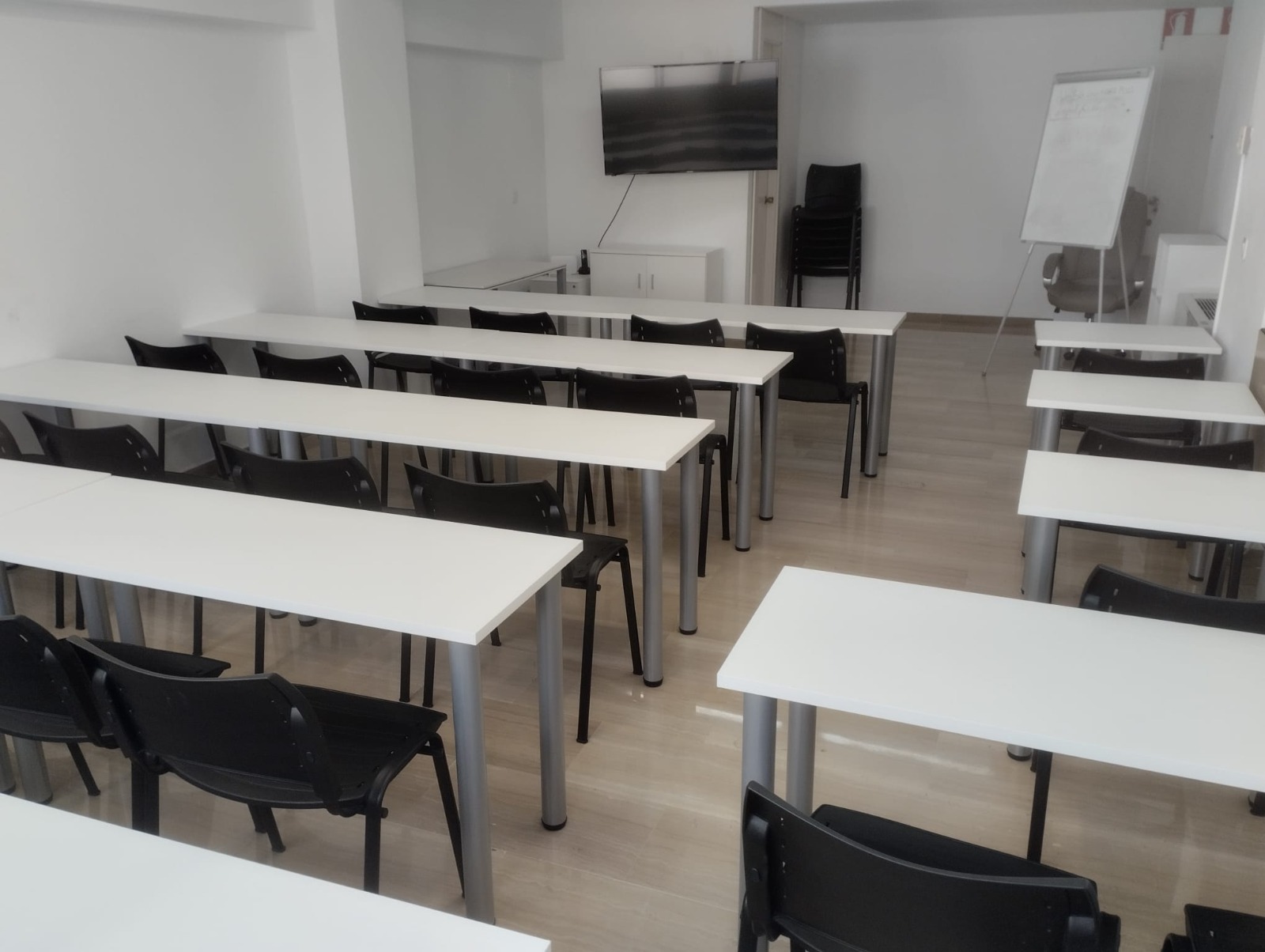 El aula cuenta con equipamiento audiovisual profesional, incluyendo Smart TV de 65″ o proyector con pantalla de 180×180, lo que permite impartir formaciones dinámicas y presentaciones corporativas de alta calidad. Además, ofrece luz natural, WiFi de alta velocidad, agua mineral, material de papelería y zona con videovigilancia para garantizar una experiencia cómoda y segura.